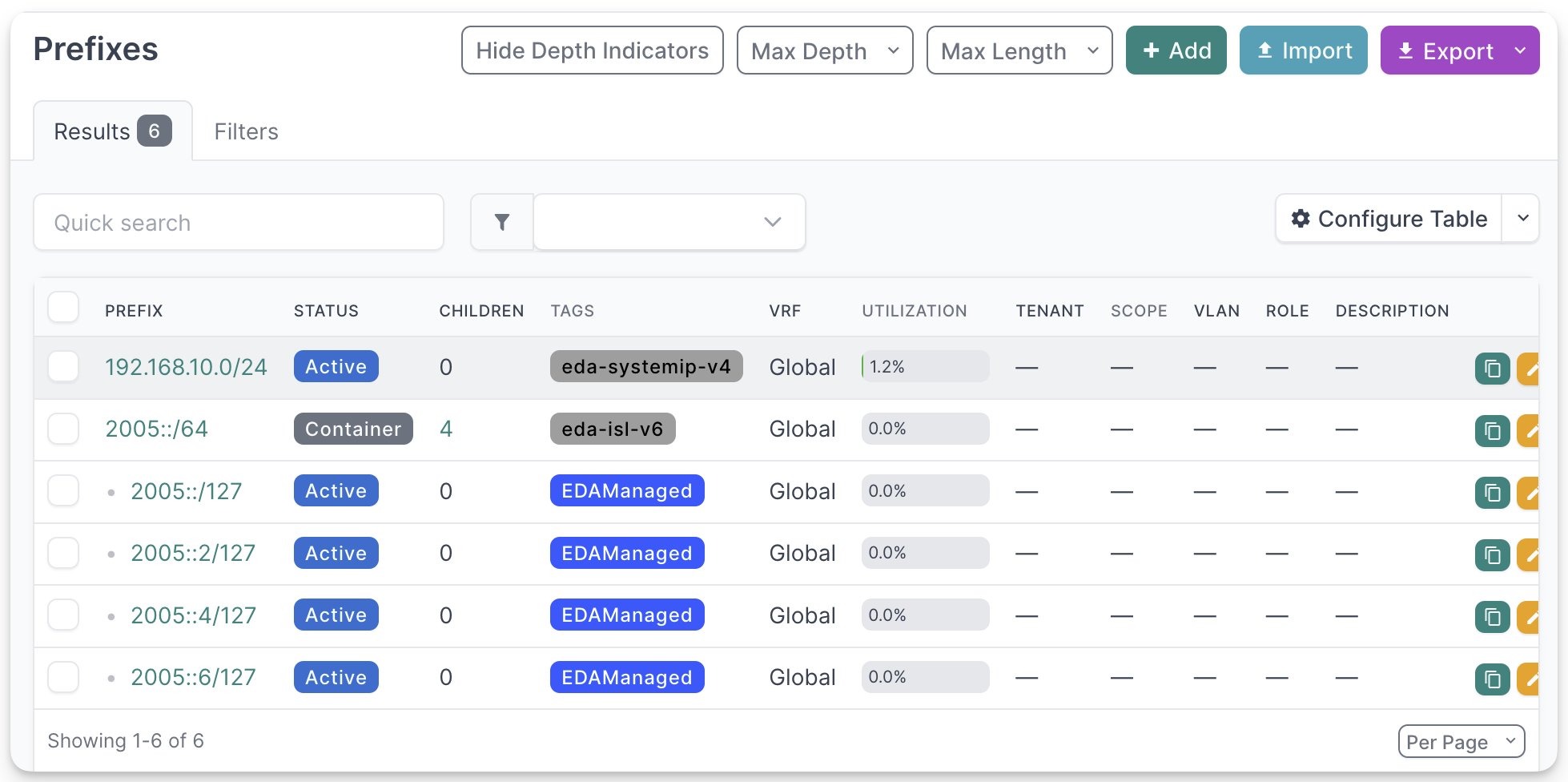 We create the eda-isl-v6 tag first and then the Prefix 2005::/64 with the Status=Container and this tag assigned.